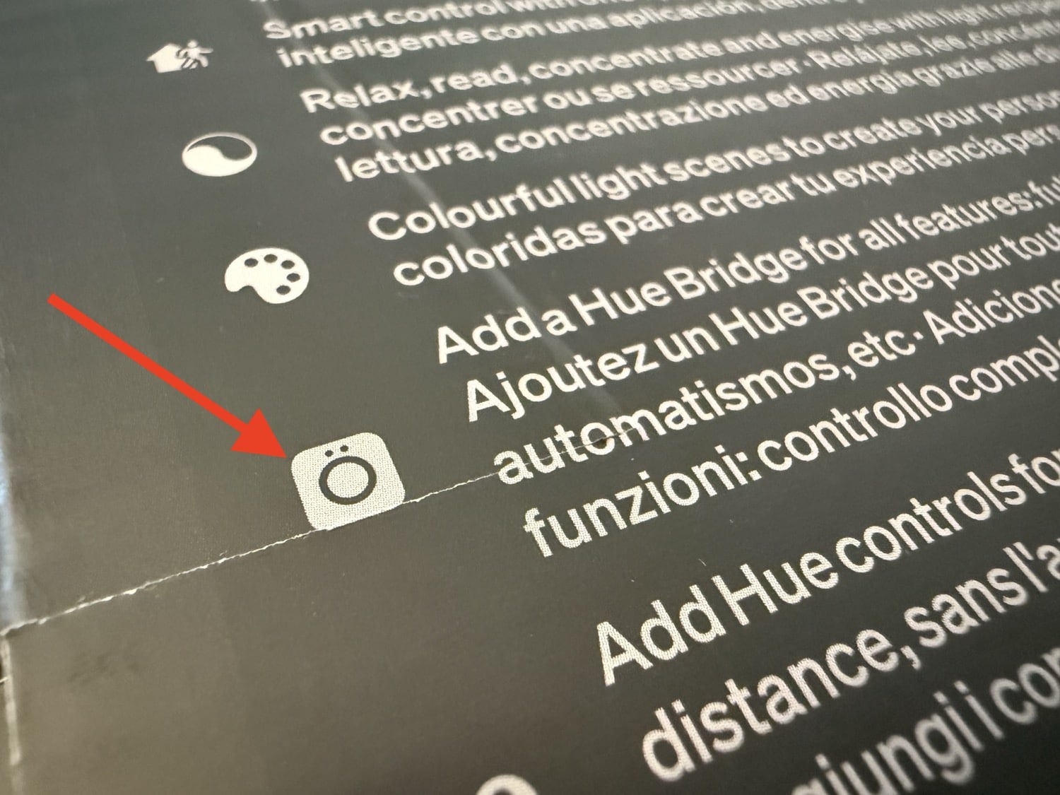 Auf der Verpackung ist der obligatorische Hinweis abgedruckt, dass im Zusammenspiel mit der Hue Bridge alle Funktionen freigeschaltet werden. Das Icon der Hue Bridge ist allerdings außergewöhnlich: Statt drei Punkten für die Status-LEDs sind nur zwei Punkte zu sehen. Außerdem wirkt der Button der Bridge deutlich größer als auf vorherigen Verpackungen. Vergleicht das folgende Icon gerne mal mit dem auf einem Karton, den ihr bei euch Zuhause habt.