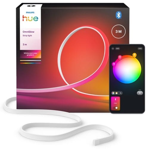 Der bisher beste Leuchtstreifen von Philips Hue hört auf den Namen Hue OmniGlow Lightstrip. Gleichmäßiges, helles Licht ohne sichtbare LED-Punkte. Der Leuchtstreifen basiert auf der CSP-Technologie (Chip-Scale-Packaging) und kreiert dank extrem vieler kleiner LEDs einen völlig nahtlosen und gleichmäßigen Lichteffekt.