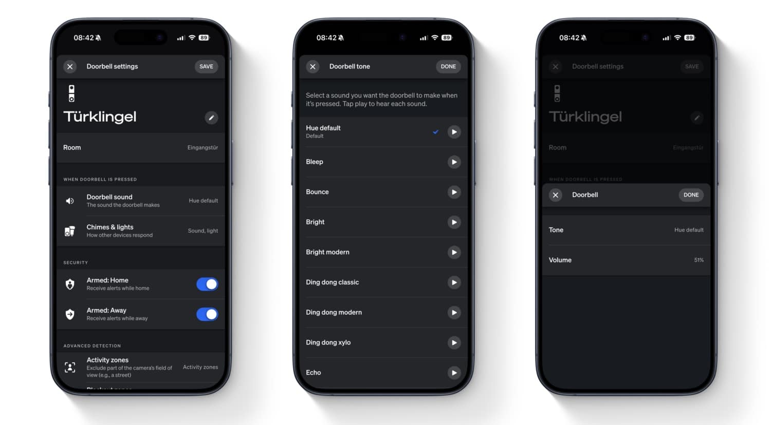 Auf dieses Thema wurde ich in den vergangenen Monaten tatsächlich schon mehrfach angesprochen. Nachdem Philips Hue den LED-Ring rund um den Klingelknopf bereits seit einiger Zeit bei Annäherung automatisch aktiviert, gibt es nun weitere Optionen für den eigentlichen Knopfdruck. Bei diesem wurde bisher immer ein Standard-Sound in einer festen Lautstärke abgespielt.