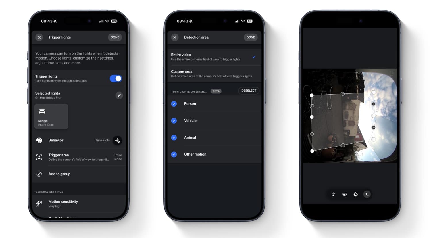 Die Philips Hue Secure Videotürklingel kann ja bekanntlich Lampen bereits einschalten, wenn Bewegungen erkannt werden. Dieses Verhalten könnt ihr jetzt noch etwas genauer definieren. Im Bereich “Lampen auslösen” gibt es einen neuen Menüpunkt mit dem Namen Auslösebereich. Dort könnt ihr im Kamerabild einen Bereich festlegen, auf den sich die Bewegungserkennung beschränken soll. Ebenso könnt ihr die Bewegungserkennung auf Personen, Fahrzeuge, Tiere oder andere Bewegungen beschränken.