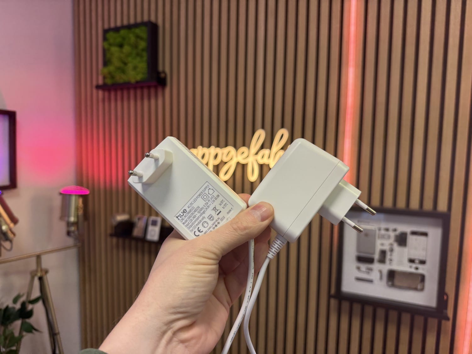 Der Hue Flux Ultra Bright Lightstrip nutzt ein neues Netzteil mit bis zu 60 Watt Leistung. Das fällt mit 8,9 x 5,5 x 3,5 Zentimetern gar nicht mal so viel größer aus, ist aber bedeutend breiter als tiefer. Das kann gerade in Mehrfachsteckdosen mit 45-Grad-Winkel der Stecker zum Problem werden. Auch bei diesem Netzteil ist das Kabel fest verbunden und 150 Zentimeter lang.