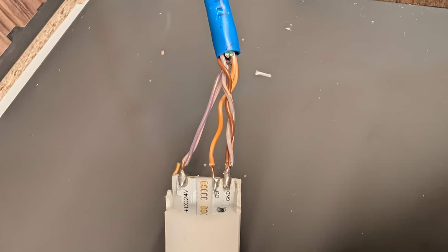 Bei meinem ersten Versuch hatte ich ein 3-adriges 18-AWG-Kabel in der Wand. Als ich das Kabel zwischen dem Controller und dem Streifen verlegte, funktionierte es nicht, es flackerte nur komisch. Das Datensignal muss ziemlich schnell sein und der Dateneingang am CSP ist empfindlich. Ich habe ein Cat-6-Kabel gezogen und ein Paar für Daten und Masse, ein Paar für +24 V und ein Paar nur für Masse verwendet. Das kannst du auf dem Bild der Lötstelle am Streifen sehen. Nachdem ich ein besseres Kabel zwischen ihnen verlegt hatte, funktionierte es super. Diese Streifen waren im Vergleich zu den Solo-Lichtstreifen überraschend einfach zu löten, da sie 3 statt 6 Kontakte haben.