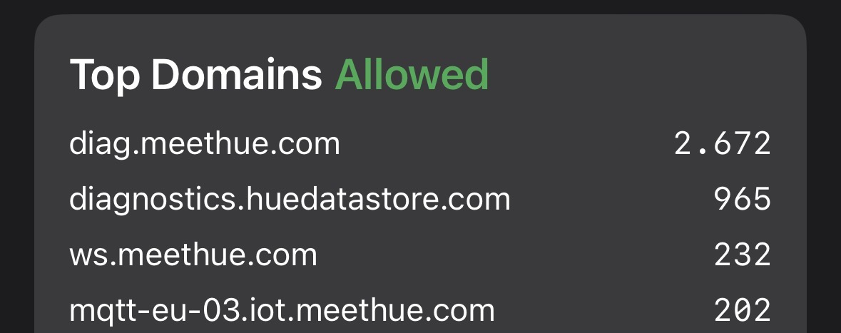 Ich hab schon seit längerem ein Pi-hole zur Trafficüberwachung im Netzwerk hängen. Was mir auffällt, dass ich seitdem ich die Hue Bridge pro habe, mein Traffic sprunghaft angestiegen ist. Gerade morgens sendet die Bridge bis zu 2000 Anfragen pro Stunde an Hue Server. Dabei sind die wohlgemerkt nicht geblockt.