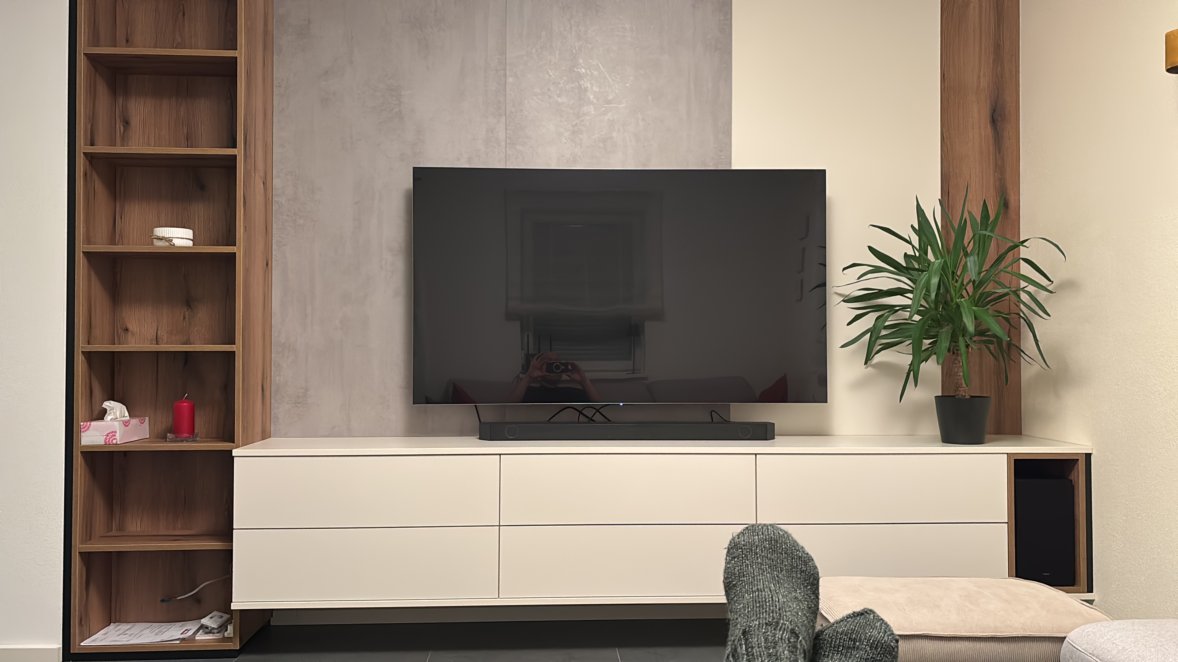 Steckdose unf Kabelkanal hinter dem TV und unter dem Board ist ebenfalls ein Auslass *am Foto sieht man noch Kabeln, diese wurden nach Wunsch! *hust* meiner Frau, natürlich beseitigt….